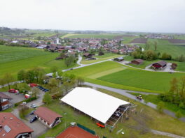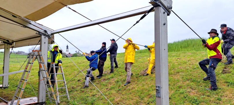 Bericht und Bilder: Norbert Zehrer/Feuerwehr Söchtenau – Aufbau des Festzeltes mit Aufnahme einer Drohne und Aufbau am Boden bei Regen