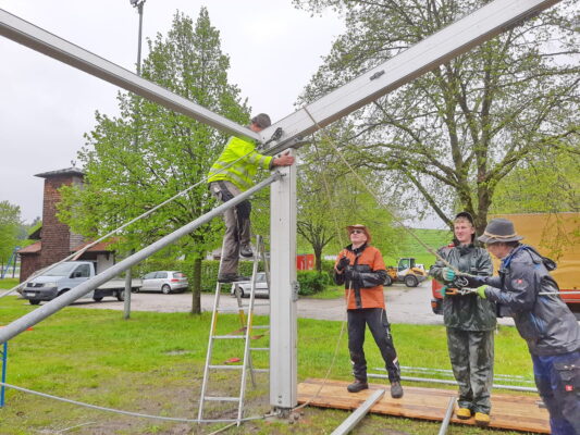Bei strömenden Regen stellten die Mitglieder der Freiwilligen Feuerwehr Söchtenau das 1200-Mann-Zellt am Söchtenauer Sportgelände für die 150-Jahr-Feier des Vereins auf. Bürgermeister Bernhard Summerer stellte bei seiner Stippvisite schmunzelnd fest, dass er als Schirmherr noch kräftig üben müsse, damit es dann während der Festwoche endlich schönes Wetter gäbe.