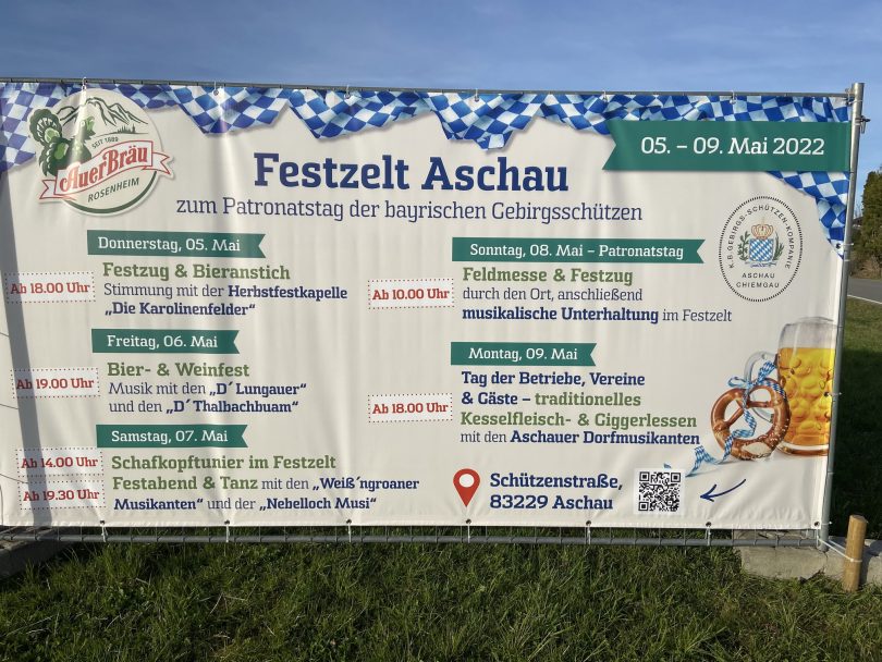 Am kommenden Wochenende findet der Patronatstag der Bayerischen Gebirgsschützen in Aschau i. Chiemgau statt. Dazu gibt es folgendes Fest(zelt)-Programm: