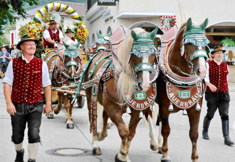 Wann ist ein Brauch ein Brauch? Ein neuer Brauch, der in fast 20 Jahren zur Gewohnheit geworden ist: zur Eröffnung des Aschauer Marktes zogen die Aschauer Vereine, angeführt von der Aschauer Musikkapelle in einem Festzug vom Hans-Clarin-Platz zum Festzelt an der Schützenstraße. Die Wirtsfamilie Heinrichsberger und die Festzeltbedienungen, die Vertreter der Auer-Brauerei und das Auer-Bräu Prunkgespann zogen mit durch die Aschauer Straßen zum Festzelt an der Schützenstraße. Besondere Aufmerksamkeit erhielt dabei das Gespann von Sebastian Ruhsamer mit den Kindern der Aschauer Trachtenvereine. Erstmal gab es zum 450. Marktjubiläum im Jahr 2005 einen Festeinzug, seitdem ist dieser Festzug ein lieb gewordener Brauch geworden. Am Abend spielten die Priener Buam zur Unterhaltung auf.