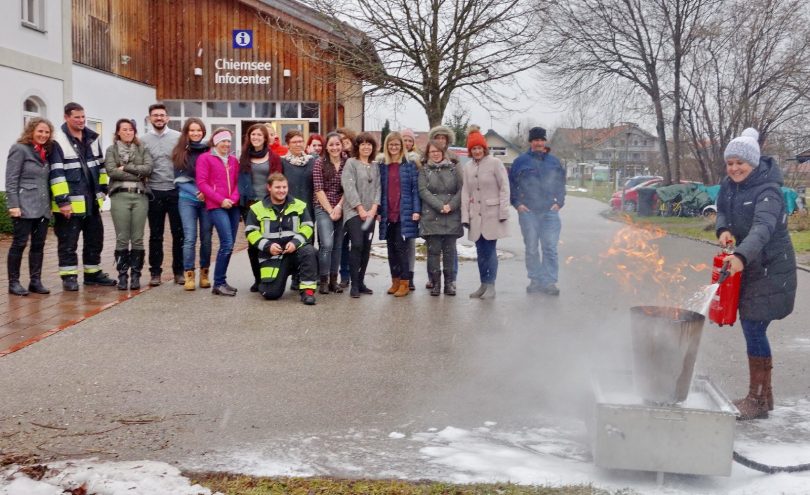 Eine Brandschutz-Übung veranstaltete die Feuerwehr von Bernau (mit Material-Unterstützung von der Priener Feuerwehr) für die Mitarbeiterinnen und Mitarbeiter im Chiemsee-Info-Center in Bernau-Felden. „Ob Veranstaltungen mit Leuten im oberen Stockwerk oder das umfangreiche und aus viel Papier bestehende Lager im Keller, im Falle eines Brandfalles müssen wir gerüstet sein“ – so Geschäftsführerin Christina Pfaffinger vom Tourismusverband Chiemsee-Alpenland. Nach den theoretischen sowie praktischen Informationen und Übungen, unter anderem mit dem Handfeuerlöscher, bedankte sich die Touristiker-Schar bei Kommandant Markus Praßberger und Jugendwart Stefan Huber von der Feuerwehr Bernau für ihre Erläuterungen.