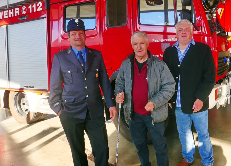 Foto: Hötzelsperger – Wiedersehen bei der Feuerwehr Atzing – von links: Atzings Erster Kommandant Paul Huber junior, ehemaliger Kommandant Paul Huber senior und Peter Huber von der Feuerwehr Bielefeld.