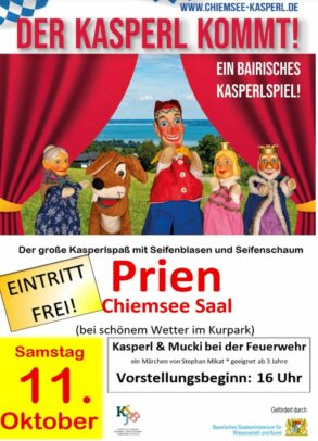 Vorhang auf für ein ganz besonderes Vergnügen: Am Samstag, den 11. Oktober um 16 Uhr , verwandelt sich der Chiemsee Saal in eine Bühne voller Spaß, Magie und spritziger Überraschungen. Bei schönem Wetter wird sogar die Freilichtbühne im Kurpark bespielt – beste Sicht auf ein Kasperl-Abenteuer inklusive. Möglich wird dieser Theaterspaß durch die Gastspielförderung des Verbands Freier Kinder- und Jugendtheater in Bayern mit Mitteln des Bayerischen Staatsministeriums für Wissenschaft und Kunst, die das Chiemsee-Kasperltheater erhalten hat.