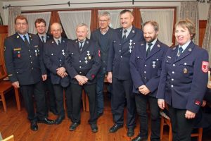 Ehrung: Kreisbrandinspektor Franz Hochhäuser, Kommandant Georg Ablinger, Josef Moosmüller, Georg Wöhrer, Bürgermeister Bernhofer, Leonhard Scheck, Michael Scheck und stellv. Kommandantin Veronika Wöhrer