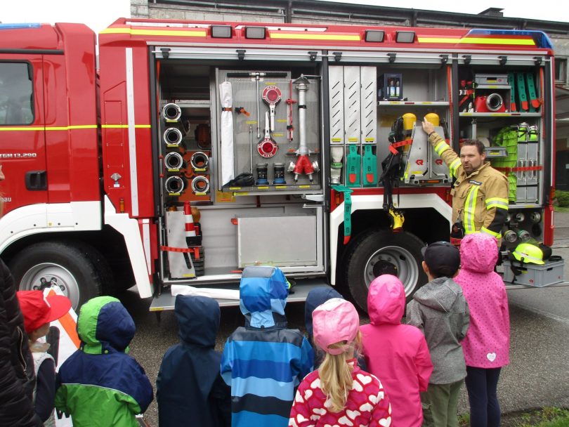 Alle Kinder durften dann das Löschfahrzeug der Aschauer Wehr vor dem Kindergarten anschauen. Stolz führten die beiden Feuerwehrleute ihr Löschfahrzeug vor, sie erklärten das Fahrzeug und das Gerät, den schweren Atemschutz und die ganzen Werkzeuge rund ums Auto. Der Höhepunkt für alle Buben und Mädchen war es schließlich, im Löschfahrzeug sitzen zu dürfen und dazu schaltete der freundliche Feuerwehrmann dann auch noch das Blaulicht und das Martinshorn ein! Mit lautem „Tatü-Tata“ verabschiedeten sich Tobias Brinkmann und Markus Vordermayer zum Schluss aus dem Spatzennest.