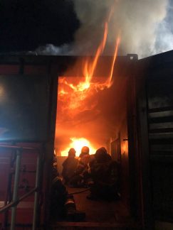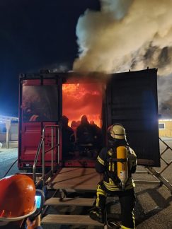 Hierzu wurde in dem mit Spanplatten ausgekleideten Container ein Feuer entzündet, sodass nach kurzer Zeit im Inneren alles unter dichtem Brandrauch stand. Bei Temperaturen über 600 Grad Celsius konnte jede/r Teilnehmer*in anhand der Rauchentwicklung die Anzeichen einer Durchzündung rechtzeitig erkennen und den Rauch durch gezielte Löschstöße kühlen, um die Brandbekämpfung unter besserer Sicht gezielt durchzuführen.