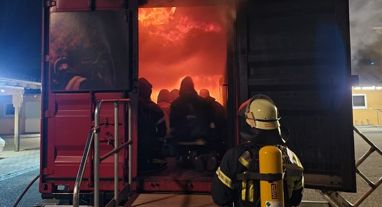 An fünf Tagen konnten insgesamt 64 Atemschutzgeräteträger*innen der umliegenden Feuerwehren aus dem Landkreis Rosenheim eine sehr realitätsnahe Ausbildung zum Thema „Brandbekämpfung im Innenangriff“ absolvieren. In dem holzbefeuerten Brandcontainer lernten die Teilnehmer*innen hautnah, in gefährlichen Situationen wie etwa bei Zimmerbränden richtig zu handeln und zu reagieren.