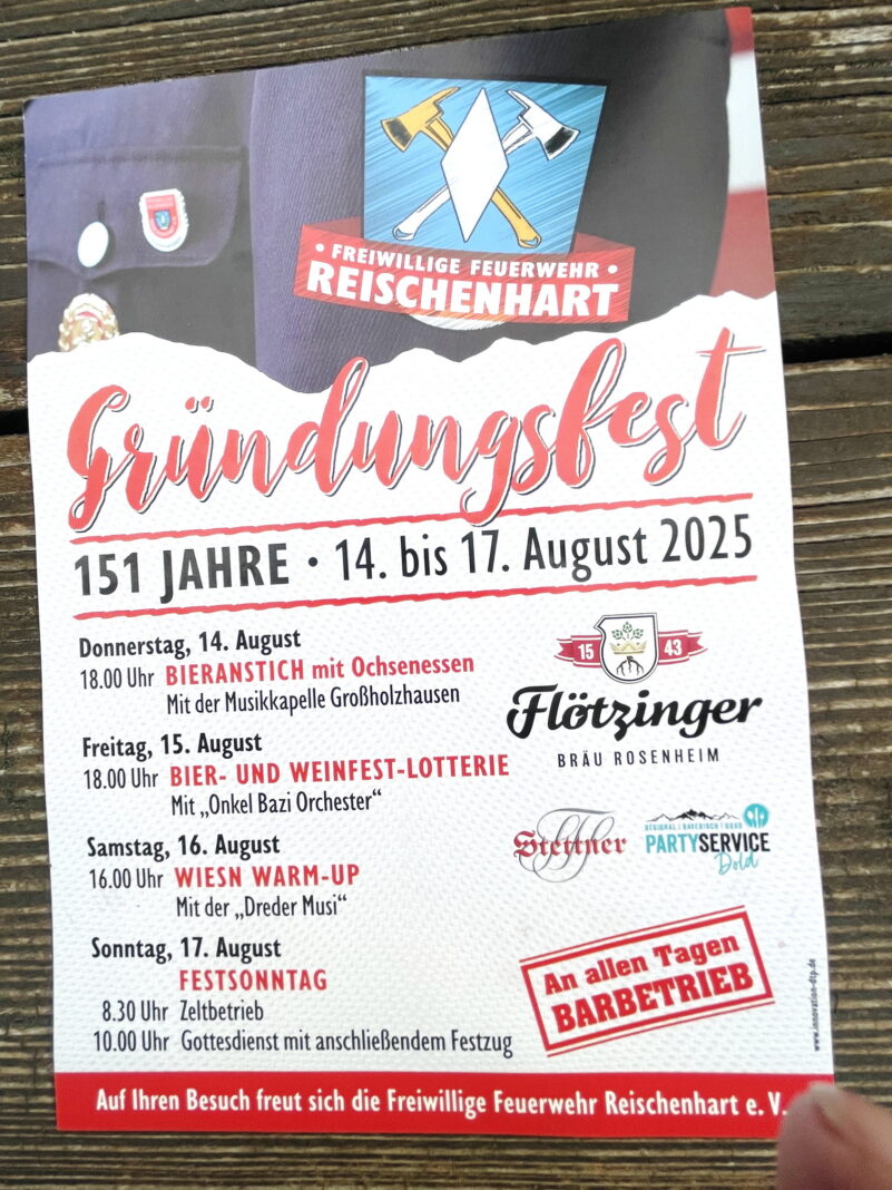 Seit 151 Jahren gibt es die Freiwillige Feuerwehr von Reischenhart – dies wird heuer vom 14. August bis Sonntag, 17. August mit einem Gründungsfest gefeiert.