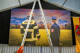 Ein Blickfang im Festzelt ist das großformatige Bühnenbild mit Blick auf die Alpen: Zwei Feuerwehrleute – symbolisch für Tradition und Zusammenhalt – blicken in die Weite. Auch das aufwendig dekorierte Zelt mit weiß-blauen Stoffbahnen, Kränzen und den klassischen Bierzeltgarnituren zeugt vom hohen Anspruch an Gestaltung und Gastfreundschaft.