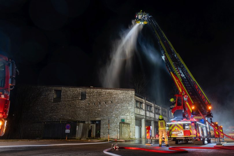 Alarm für die Aschauer und Sachranger Feuerwehr: „Feuer in der Sporthalle, das gesamte Gebäude ist verraucht, mehrere Personen werden vermisst“. Der Aschauer Kommandant Tobias Brinkmann legte eine umfangreiche und anspruchsvolle Übung für die beiden gemeindlichen Wehren an. Kurz vor dem Beginn der Abbrucharbeiten der Sporthalle ermöglichte es die Gemeinde Aschau, mit allen Einsatzkräften ausgiebig in dem leeren Gebäude zu üben. Knapp 60 aktive Feuerwehrleute und alle Fahrzeuge kamen zum Einsatz, besonders bewährte sich wieder einmal der Einsatz der Drehleiter, die den Löscheinsatz von oben herab ermöglichte.