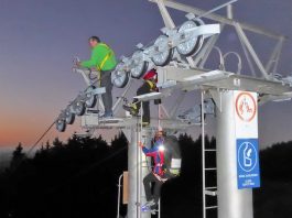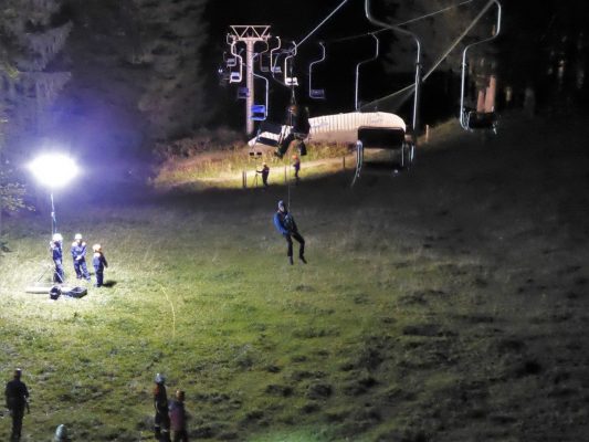 Nach der Alarmierung dauerte es nicht lange bis Feuerwehren und Bergwacht eintrafen. Ein Feuerwehrtrupp, ausgerüstet mit schwerem Atemschutzgerät, drang sofort in den brennenden und verqualmten Maschinenraum vor und rettete dort die beiden Bahnmitarbeiter. Nach der erfolgten Rettung brachte man sie sofort aus dem Gefahrenbereich. Dort übernahmen Spezialkräfte der Bergwacht die Geretteten, versorgten beide medizinisch und bereiteten den angenommenen Weitertransport in ein Krankenhaus vor. Zeitgleich verlegten Einsatzkräfte der Feuerwehren die zur Löschung des Brandes benötigten Schlauchleitungen. Die Bergwacht begann unterdessen mit den technischen Vorbereitungen zur Befreiung der Sesselbahnbenutzer aus ihrer misslichen Lage. Hierzu musste vom letzten Stützfeiler der Bahn eine provisorische „Seilbahn“ zu den Sesselbenutzern gelegt werden. Nachdem diese stand, seilten sich Mitglieder der Bergwacht zu den einzelnen Sesseln der Reihe nach ab und befreiten die „Fahrgäste“. Einzeln wurden sie dabei auf den tiefer liegenden Wiesengrund sicher abgeseilt und von Mitgliedern der Feuerwehr und Bergwacht übernommen. Ein anderer Feuerwehrtrupp steckte einen angenommenen Hubschrauber-Landeplatz, nicht weit vom Ort des Geschehens entfernt, in der Nähe der Mittelstation ab. Nach Übungsende versammelten sich alle Teilnehmer auf dem Vorplatz der Kabinenbahn zur Endbesprechung. Der Kommandant der Grainbacher Feuerwehr, Bernhard Irger begrüßte die Teilnehmer und sprach über den Ablauf der Übung. Martin Gruber, Hans Huber und Christoph Heibler und Vertreter der Bergwacht lobten die gute Zusammenarbeit zwischen den einzelnen Feuerwehren und der Bergwacht und wiesen auf deren hohen Ausbildungsstand hin. Auch die erfolgreiche Ausbildung des Feuerwehrnachwuchses sprach der Bürgermeister an. All dies sei nur durch das große Engagement der Verantwortlichen von Feuerwehr und Bergwacht zu erreichen. „Aus all diesen Gründen bekommen die Samerberger Feuerwehren die notwendige Unterstützung von Seiten der Gemeinde“, so Bürgermeister Christoph Heibler, der sich noch extra bei allen Verantwortlichen für die bisher geleistete Arbeit in ihren jeweiligen Aufgabenbereichen bedankte. Zum Schluss wurden alle Übungsteilnehmer auf Gemeindekosten zu einer Brotzeit in die Wirtsräume der „Kräuterhexe“ eingeladen.