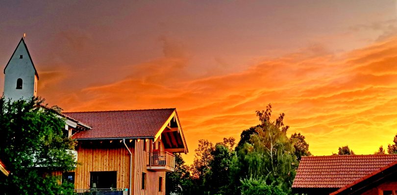 Eine mächtige Gewitterstimmung war am Freitagabend über Grainbach und über dem Samerberg zu sehen – wie diese Aufnahme mit der Grainbacher Kirche und schier brennenden Wolken zeigen.