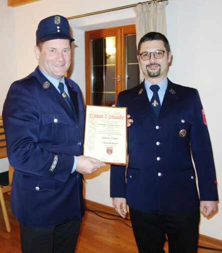 Viele Vereinsaktivitäten mit guten finanziellen Ergebnissen des Familientags beim Frühschoppen (unter anderem mit der Drehleiter der Priener Feuerwehr) sowie der wood-party, aber auch mit zahlreichen Ausgaben (unter anderem in die Kleider-Ausstattung) waren von Vorstand Martin Loferer, Schriftführer Andreas Riepertinger und Kassenprüfer Florian Rauch (Prüfung erfolgte mit Markus Kalal) zu vernehmen. Eine persönliche Gratulation für die einwandfreie Vereinsführung und für das gute Wirtschaften überbrachte Bodo Sagebiel, Vorstand der Priener Feuerwehr. Er war zusammen mit seinem Stellvertreter Josef Palk, mit den Kommandanten Samuel Witt und Johannes Herzinger sowie mit Feuerwehrarzt Dr. Otto Steiner zur Atzinger Versammlung gekommen. Im Beisein der Atzinger Feuerwehr-Ehrenmitglieder Leopold Schlosser und Hans Riepertinger bedankte sich Vorstand Sagebiel auf die vorzügliche Zusammenarbeit zwischen den beiden Feuerwehren und der Gemeinde.
