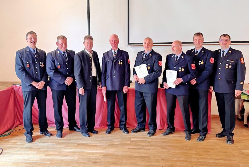 Abschließend erfolgte eine Ehrung von langjährigen Mitgliedern, so wurden Sebastian Wimmer, Ehrenvorstand Leo Fischer und Josef Greilhuber für ihre 40-jährige Mitgliedschaft geehrt. Das Bild zeigt die drei neben Bürgermeister Andi Fenzl (3. von links). Außerdem zu sehen ist Andi Böck (2. Kommandant), Franz Wimmer (1. Kommandant), Josef Kotter (1. Vorstand, 2. v.r.) und Franz Hochhäuser (Kreisbrandinspektor, rechts).