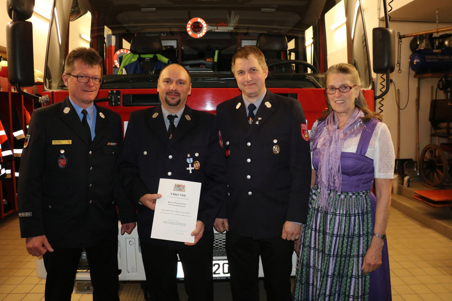 Hohe Auszeichnungen für die Umrathshauser Feuerwehr: Michael Klein erhielt das silberne Feuerwehrehrenzeichen des Freistaats Bayern für 25 Jahre aktiven Feuerwehrdienst. (von links) Kreisbrandmeister Stefan Pfliegl – Michael Klein – Kommandant Martin Dialler – Bürgermeisterin Marianne Steindlmüller