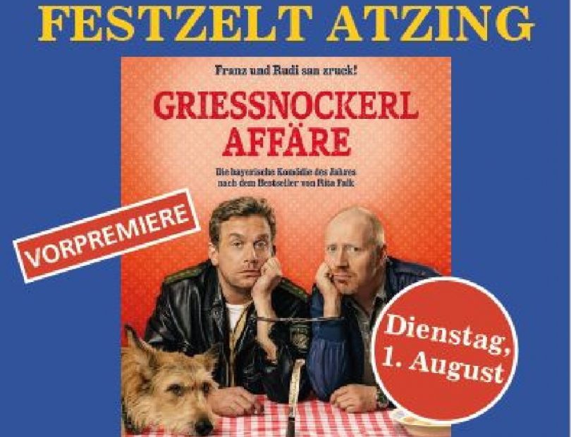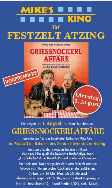 In einer Veranstaltungspause des Atzinger Trachtenvereins „Daxenwinkler“ anlässlich des 81. Gautrachtenfestes vom Chiemgau-Alpenverband vom 27. Juli bis 7. August veranstaltet Mikes Kino aus Prien einen besonderen Filmabend im Atzinger Festzelt. Noch vor dem Bundesstart kommt es zu einer Vorpremiere des Films „Griessnockerl-Affäre“, dem vierten Teil der Eberhoer-Reihe von Rita Falk. Das Film-Erlebnis beginnt am Dienstag, 1. August um 19 Uhr mit dem Einlass, ab 20 Uhr mit der fünfköpfigen Band „Kupfadache“ (Herzblut-Sound made im Chiemgau) und gegen 21.15 Uhr mit dem Film-Start. Für Cocktails und Bewirtung wird gesorgt sein. Karten sind nur an der Abendkasse erhältlich.