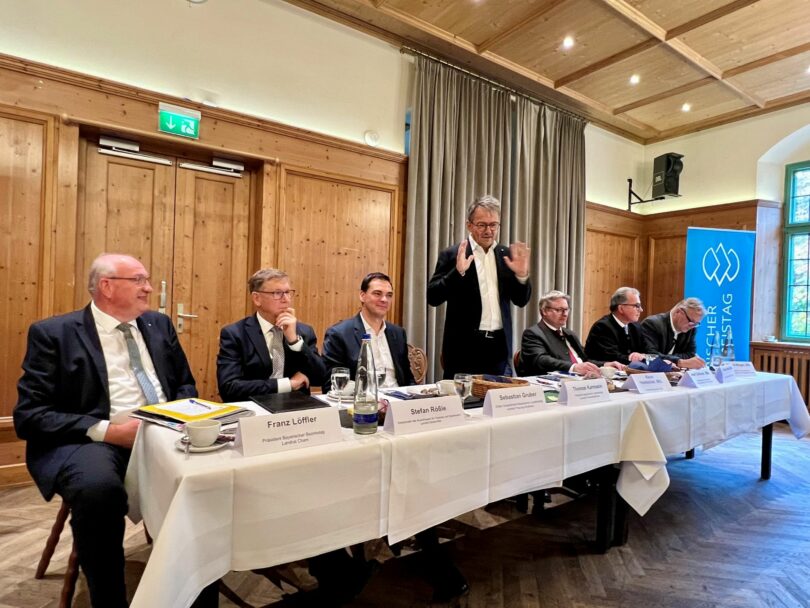 Titelbild: v. l.: LR Franz Löffler, Lkr. Cham, Vorsitzender des Ausschusses für Wirtschaft und Verkehr, LR Stefan Rößle, Lkr. Donauries, Vorsitzender des Ausschusses für Finanzen und Sparkassen, LR Sebastian Gruber, Lkr. Freyung-Grafenau, Erster Vizepräsident des Bayerischer Landkreistag, LR Thomas Karmasin, Lkr. Fürstenfeldbruck, Präsident des Bayerischer Landkreistag, Josef Zellmeier, MdL, Vorsitzender des Ausschusses für Staatshaushalt und Finanzfragen im Bayerischen Landtag, Florian Streibl, MdL, Vorsitzender der FREIE WÄHLER-Landtagsfraktion, Roland Weigert, MdL, Staatssekretär für Wirtschaft, Landesentwicklung und Energie;