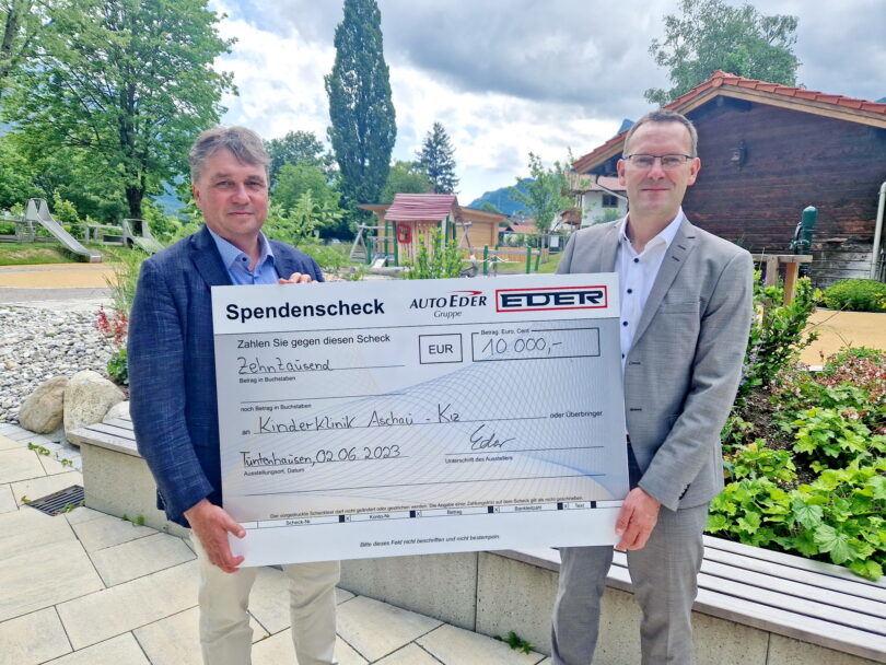 Peter Eder, Geschäftsführender Gesellschafter der Eder Familienholding in Tuntenhausen überreichte dem Geschäftsführer des KIZ Chiemgau Stefan Schmitt auf dem neu konzipierten Spielplatz des Behandlungszentrums Aschau eine Spende in Höhe von 10000 Euro. Bei der Übergabe des Schecks sagte Peter Eder: „Aus unserer Sicht leistet das KIZ hervorragende Arbeit, vor allem in einem Bereich, der unsere Kinder und Jugendliche betrifft und in dem jegliche Hilfe dringend nötig ist“. Stefan Schmitt bedankte sich im Namen der Kinder im KIZ Chiemgau für diese großzügige Spende!