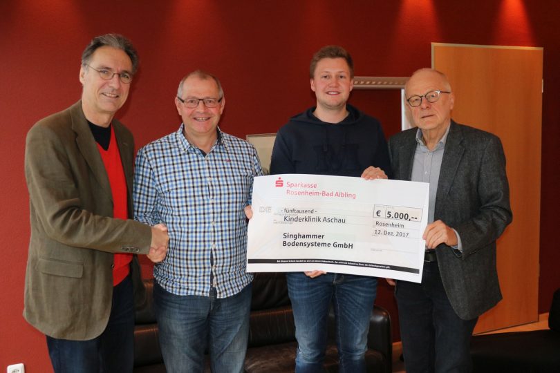 „Anstelle von Weihnachtsgeschenken und Kundenpräsenten“ beschlossen Franz und Tobias Singhammer von der Firma Singhammer Bodensysteme in Rimsting das vorgesehene Geld anderweitig zu verwenden. Das Geld sollte in der Region bleiben und so beschlossen sie den Betrag dem „Hilfswerk Aschau“, der Stiftung für die Orthopädische Kinderklinik Aschau, zur Verfügung zu stellen. Im Amtszimmer des Bürgermeisters Peter Solnar von Aschau, der zugleich Stiftungsrat des „Hilfswerks Aschau“ ist, übergaben sie 5000 Euro an Bürgermeister Solnar und Dr. Ulrich Feldmann, den Vorsitzenden des „Hilfswerks Aschau“. „Die Kinderklinik ist weitum in der Region bekannt, jeder ist schon vorbei gefahren, hat die Patienten im Ort gesehen und wenn man selber gesunde Kinder hat, weiß man um den Segen der Gesundheit. Wir wollen mit dem Geld ein wenig zur Hilfe für die Kinder beitragen und vielleicht einige andere zur Nachahmung veranlassen“, so Franz Singhammer.
