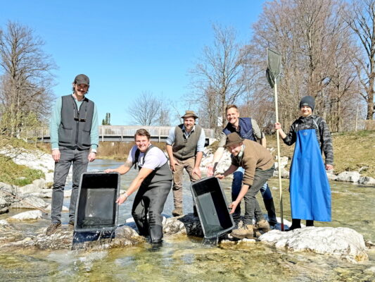 Mit dabei waren Ludwig Freiherr von Cramer-Klett (rechts), Revierjagdmeister Josef Rinner (vierter von links), Revierjäger-Auszubildender Maximilian Jöchler (dritter von links) und Markus Vordermayer (fünfter von links). Auch Aschaus Erster Bürgermeister Simon Frank (kniend links) packte tatkräftig mit an und zeigte sich begeistert von dieser naturnahen Initiative mitten im Ortskern von Aschau i.Chiemgau. Die einjährigen Jungfische wurden in der Fischzucht Alpenland in Karlstein bei Bad Reichenhall herangezogen und durch deren Auszubildenden Xaver Streitwieser übergeben. Gespendet wurden sie vom Aschauer Karl Sollinger. Ziel der Maßnahme ist es, die Fischpopulation zu stützen und langfristig zu erhalten.