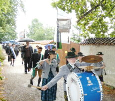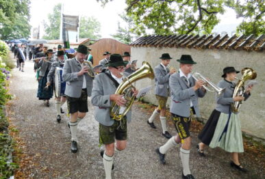 Foto 1 (mmü): Zu Beginn des traditionellen Fischerjahrtages der Fischereigenossenschaft Chiemsee auf der Fraueninsel bewegte sich der Kirchenzug zur Klosterkirche. Den von der Blaskapelle Prien untermalten Gottesdienst zelebrierte der Pfarrer Andreas Przybylski. Die Blasmusikanten untermalten auch die Messe und die anschließende Versammlung.