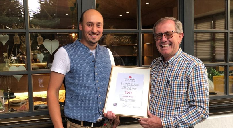 Dominik Minholz vom „Restaurant Fischerei Minholz“ am Chiemsee konnte am vergangenen Wochenende erfreut die Auszeichnung zum „Genussführer-Lokal“ aus den Händen von Manfred Mödinger, Leitungsmitglied der Regionalgruppe „Slow Food Chiemgau-Rosenheimer Land“, entgegennehmen.