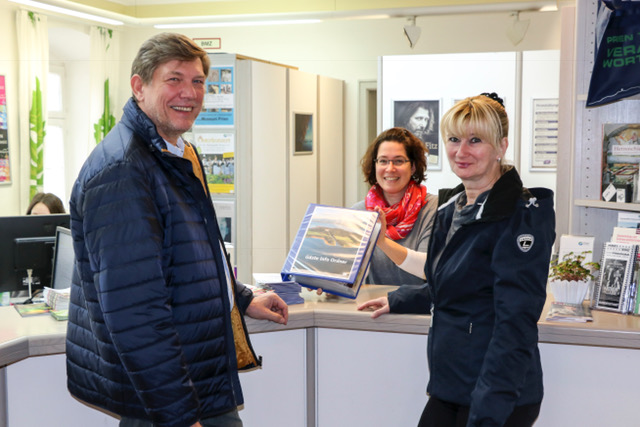 Bildunterschrift: Die langjährigen und sehr serviceorientierte Vermieter Brigitte und Thomas Ehrlich vom Gästehaus Ehrlich aus Prien Atzing erhalten von der PriMa-Mitarbeiterin Gabi Oberloher ihren aktualisierten „Gäste Info Ordner“.