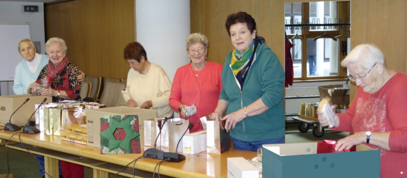 Prien hoid zsamma – Priener Senioren-Frauen packten 145 Weihnachtspäckchen – Es gibt viele Möglichkeiten, dass man sich im Alter fit hält, eine ganz besondere Art fiel den Damen vom Priener Seniorenprogramm ein. Insgesamt 145 Päckchen mit guten Sachen wurden im Rahmen eines Aktions-Nachmittags zusammengestellt. Dazu sagte Helga Stampfl als Seniorenbeauftragte der Gemeinde: „ Weihnachten naht – und so haben sich unsere Damen vom Seniorenprogramm wieder getroffen und Päckchen gepackt. In den Päckchen befindet sich neben süßen Schmankerln auch mit viel Liebe selbstgebastelte Weihnachtsdeko. Wie jedes Jahr machen die Damen all denjenigen eine Freude, die sich vieles eben nicht leisten können“.