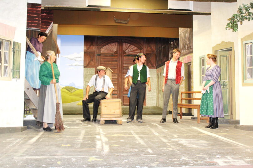 Bericht und Fotos: Volkhard Steffenhagen – Ein stimmungsvoller Probenmoment: Die Schauspieler des Volkstheaters Flintsbach stehen bereits geschminkt und in historischer Kostümierung vor der liebevoll gestalteten Kulisse von „Madame Bäuerin“.