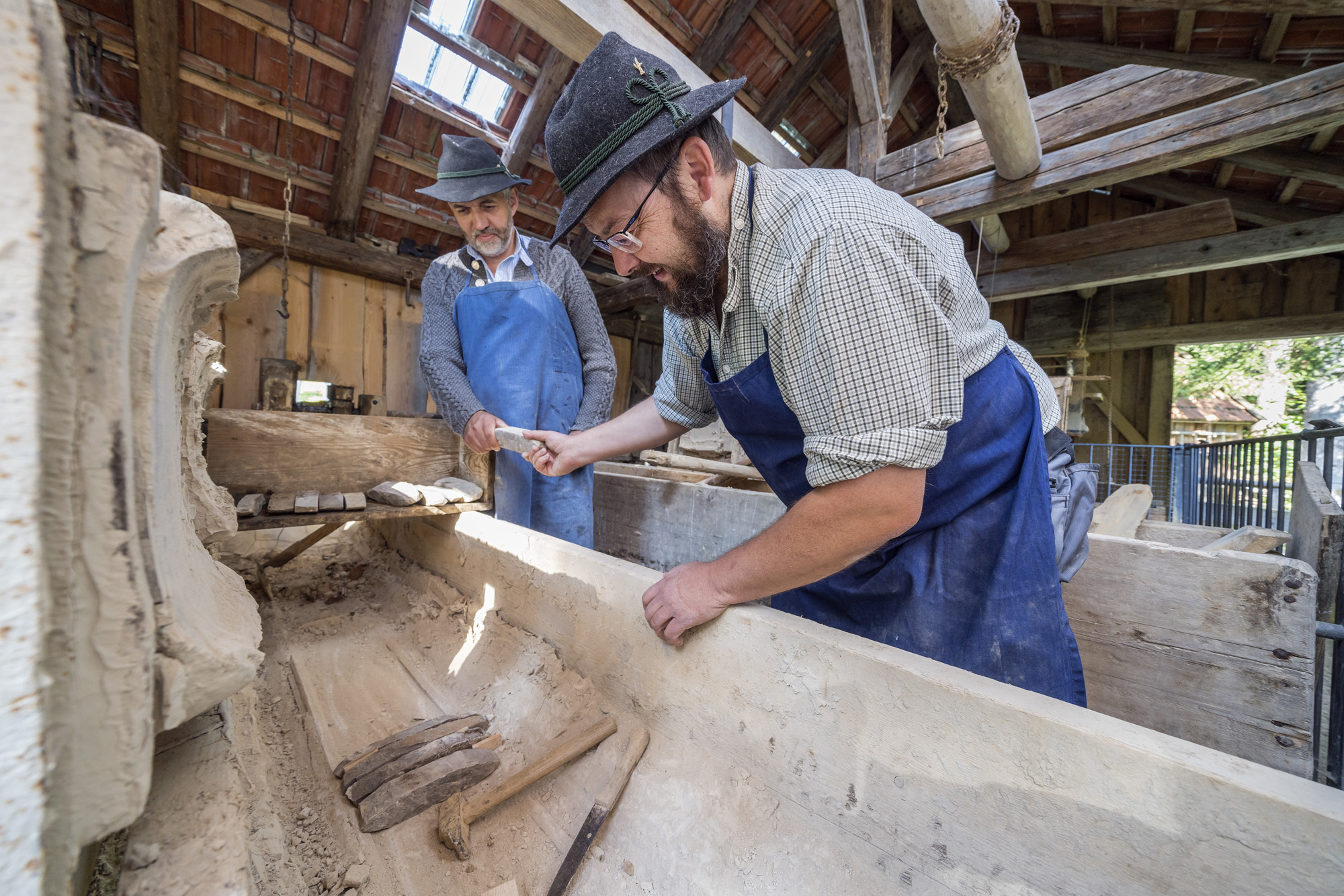 In der Wetzsteinmacherei aus Unterammergau zeigen Michael Spindler und Korbinian Ostler, wie aus groben Steinplatten Schleifsteine für Sensen, Sicheln und Co. entstehen. Bildquelle: Bezirk Oberbayern, Archiv FLM Glentleiten, Foto: Bäck.