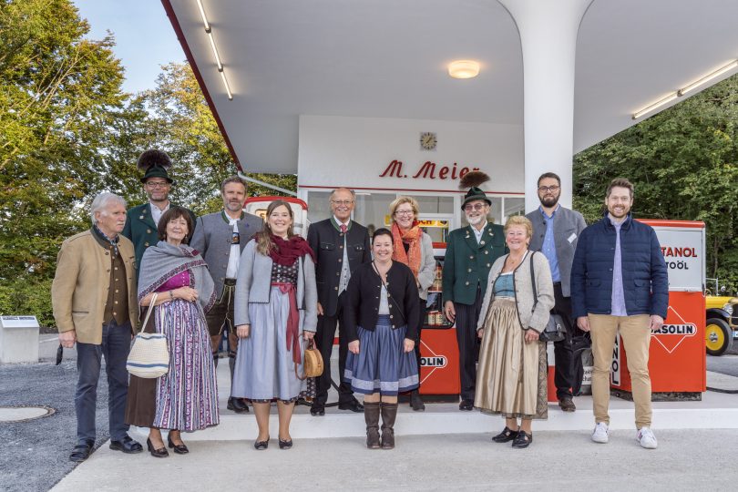 Foto: Gemeinde Unterwössen: Sie alle freuten sich über die “Wiedereröffnung der Tankstelle”. Das sind im Bild (Bezirk Oberbayern, Archiv FLM Glentleiten, Foto: Bäck) von links: Mathias Meier, Andreas Bauer, Maria Meier, Erster Bürgermeister der Gemeinde Großweil Frank Bauer, Brigitte Meier, Präsident des Bezirkstags des Bezirks Oberbayern Josef Mederer, Renate Bauer, Direktorin des Freilichtmuseums Glentleiten des Bezirks Oberbayern Dr. Monika Kania-Schütz, Josef Meier, Irmgard Meier, Leiter der Hausforschung des Freilichtmuseums Simon Kotter, Zweiter Bürgermeister der Gemeinde Unterwössen Johannes Weber.