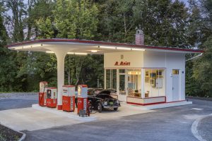 Die Tankstelle in der Dämmerung mit Beleuchtung. Bildquelle: Bezirk Oberbayern, Archiv FLM Glentleiten, Foto: Bäck.