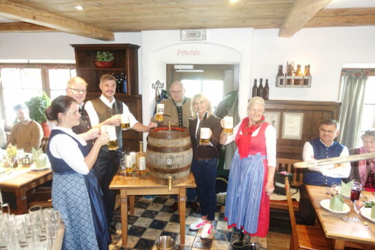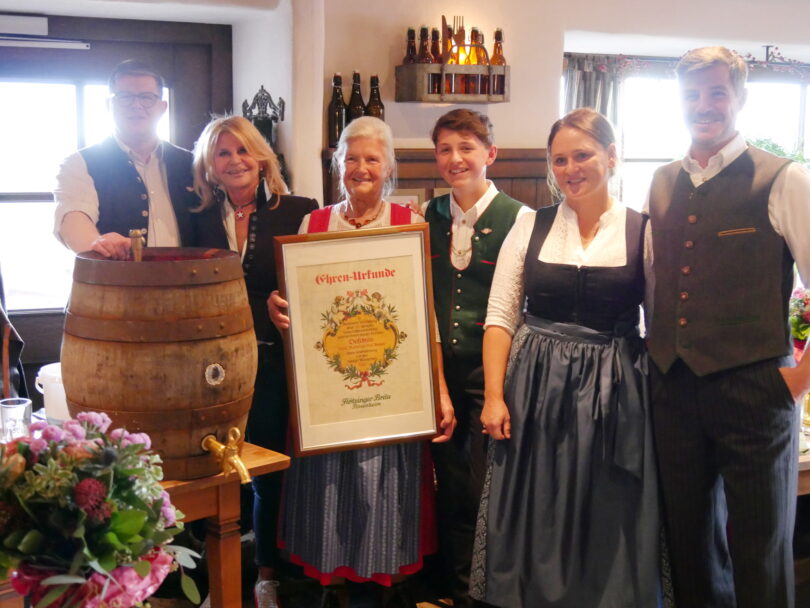 Wie Marisa Steegmüller bei ihrem Dank und Glückwunsch weiter ausführte, war das Jubiläum ein vorzüglicher Anlass, nicht nur die Geschichte vom Wirtshaus und vom Bier zu feiern, sondern auch eine außergewöhnliche Persönlichkeit zu ehren. Damit meinte sie die Senior-Wirtin Maria Wallner und sie sagte zu ihr und über sie: „Liebe Maria, Du hast über 60 Jahre Deiner Lebenszeit diesem Ort gewidmet, Du hast die Gaststätte nicht nur verwaltet, sondern sie auch mit Liebe, Hingabe und Engagement geprägt. Deine Visionen und Deine Führungsqualitäten haben diese Gaststätte zu dem gemacht, was sie heute ist“. Maria Wallner hat im Jahr 2001 die Leitung des Duftbräu an ihren Sohn Markus weitergegeben, er, seine Frau Irmi und ihre drei Söhne Matthäus, Lorenz und Ludwig führen die Tradition von Gastfreundschaft in Samerberg-Duft fort. „111 Jahre Flötzinger Bier, über 60 Jahre Engagement von Maria Wallner und jetzt bereits 22 Jahre Verantwortung durch Markus und Irmi Wallner sind Zeugnisse der Stärke und des Gemeinschaftssinnes, die in Brauerei und Berggasthof gefunden werden“ – mit diesen Worten sowie mit der Bitte, auch in den nächsten Jahrzehnten florierend zusammenzustehen ließ Marisa Steegmüller durch Markus Wallner ein Holzfass mit süffigem Flötzinger-Bier anstechen. „Ein Prosit auf unser gemeinsames Bier, auf den Duftbräu und auf die Zukunft“ – so unisono der Ausspruch ehe es zu einem gemütlichen Beisammensein kam.