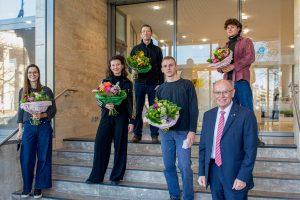 Bezirkstagspräsident Josef Mederer (vorne rechts) mit den Geehrten (von links): Lotte Schlör, Paula Alvarez-Repp, Gunther Pfeffer, Mattis Heilscher und Martin Lehmer.