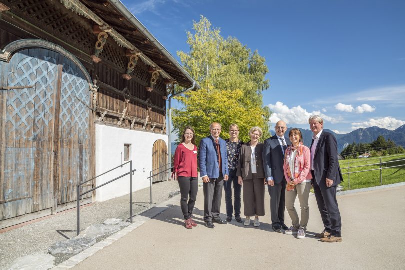 FLM_Glentleiten_Förderpreis_Vermittlung-im-Museum1.jpg: Vor dem Starkerer Stadel freuen sich über den Förderpreis “Vermittlung im Museum” v.l.n.r.: Sophie Ruhl (Museumspädagogin im Freilichtmuseum Glentleiten), Josef Mederer (Bezirkstagspräsident von Oberbayern), Beate Lohner (Museumspädagogin im Freilichtmuseum Glentleiten), Dr. Monika Kania-Schütz (Museumsdirektorin der oberbayerischen Freilichtmuseen Glentleiten und Amerang), Dr. Ingo Krüger (Geschäftsführender Vorstand der Bayerischen Sparkassenstiftung), Christine Schmid-Egger (Landesstelle für die nichtstaatlichen Museen in Bayern), Robert Christian Mayer (Sparkasse Oberland).