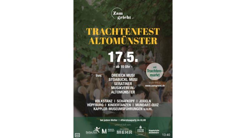 An diesem Samstag, 17. Mai, findet von 10 bis 22 Uhr das 2. Trachtenfest des Vereins „Zamgricht“ in Altomünster beim Kapplerbräu statt.