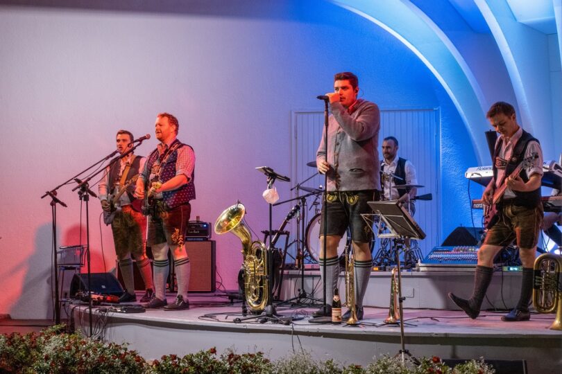 Mal traditionell, dann wieder fetzig und rockig: Die Partyband Fogelwuid heizt am Freitag, 16. August, ab 19:30 Uhr bei Kultur im Park im Brunnenhof des Kurhauses Bad Aibling kräftig ein und bringt das Publikum vor der Bühne auf Temperatur. Die Jungs aus dem Raum Rosenheim stehen an diesem Abend bereits zum dritten Mal auf der Open Air Bühne im Bad Aiblinger Kurpark. Mit bekannten Coversongs und einer guten Portion Humor sorgen sie für ausgelassene Partystimmung. Auf der Setlist finden sich Titel, die sowohl für Jung und Alt gute Unterhaltung versprechen. So geht es von Stimmungs-Hits wie „Weiß der Geier“ und „Hulapalu“ über Austropop wie „Zwickt´s mi“ und „Ham kummst“ bis hin zu Klassikern wie „Fields of Gold“ von Sting und „Purple Rain“ von Prince. Die Besucher dürfen sich also auf einen fogelwuiden Abend freuen.