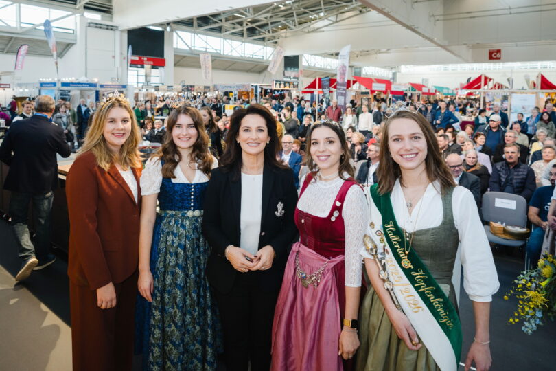 Bericht: Bayerisches Landwirtschaftsministerium – Foto: Flo Huber/StMELF – Bild zeigt Ernährungsministerin Michaela Kaniber gemeinsam mit Antonia Kraiß (Fränkische Weinkönigin, 1. v.l), Elisabeth Heimerl (Bayerische Milchkönigin, 2.v.l.), Anna Winkler (Bayerische Bierkönigin, 4.v.l.) sowie Theresa Eisenrieder (Hallertauer Hopfenkönigin, 5.v.l.) bei der Eröffnung der Food&Life 2025 in München.