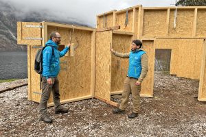 Im Nationalpark Berchtesgaden startet ein neues Forschungsprojekt zu Interaktionen von Huftieren mit ihrer Umwelt. Nationalparkleiter-Stellvertreter und Sachgebietsleiter Parkmanagement, Daniel Müller (r.) sowie Forschungsleiter Prof. Rupert Seidl (l.) testen beim Aufbau der Fangvorrichtung zur Besenderung von Rotwild am Königssee die Funktionalitäten der neuen Anlage.