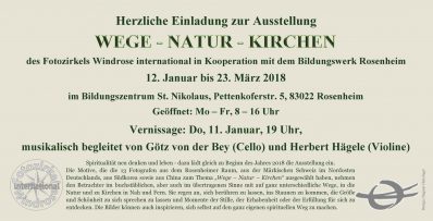 Bereits am 11. Januar findet im Bildungswerk Rosenheim die Vernissage zur Ausstellung “Wege – Natur – Kirchen” des Fotozirkel Windrose statt, zu der ich Euch und die Leser der Samerberger Nachrichten herzlich einladen möchte. Musikalisch begleitet wird die Ausstellungseröffnung durch das Priener Streicherduo Götz von der Bey am Cello und Herbert Hägele auf der Violine. Die schöne Atmosphäre der Räumlichkeiten im Bildungswerk bildet einen tollen Rahmen für die Bilder der 13 Fotografen. Spiritualität neu denken und leben – dazu lädt gleich zu Beginn des Jahres 2018 die Ausstellung ein.