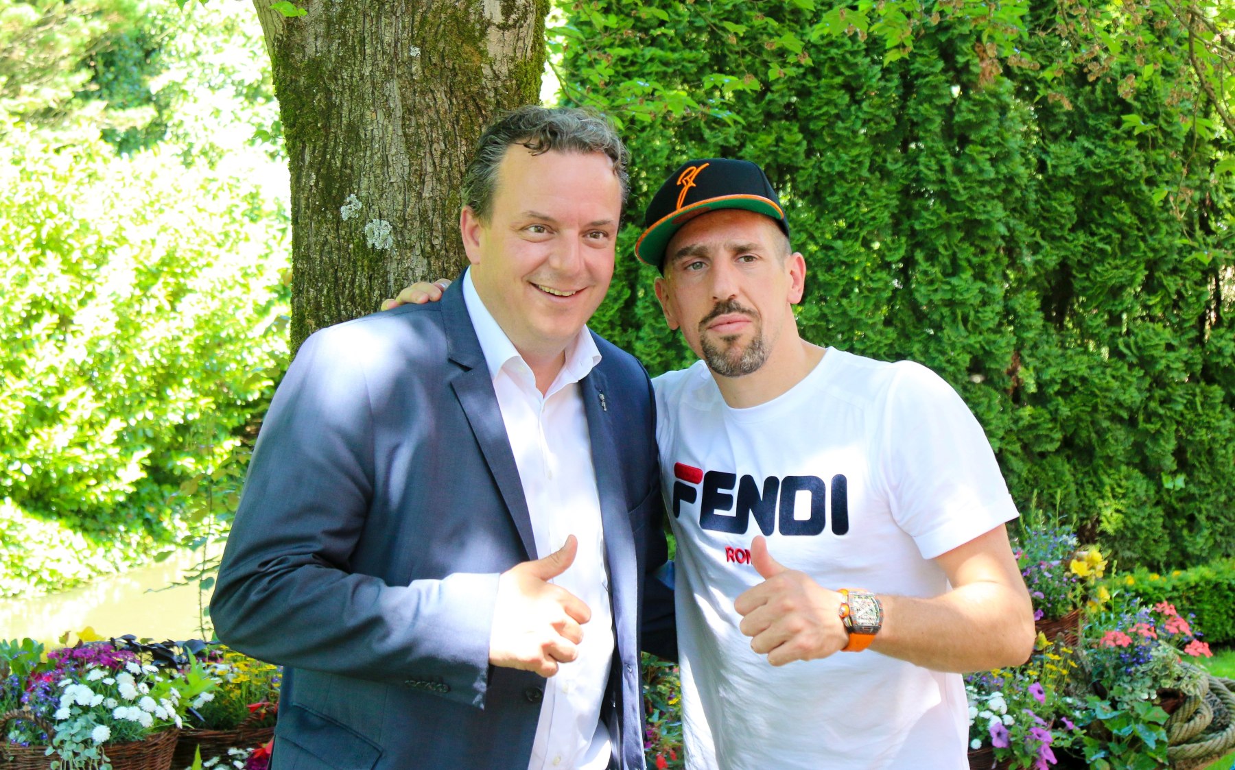 Michael Mack (Geschäftsführender Gesellschafter Europa-Park) und Ex-Bayern-Profi Franck Ribéry im Schlossgarten Balthasar im Deutschen Themenbereich des Europa-Park
