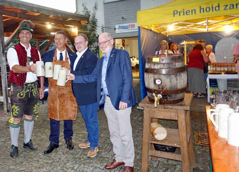 Ein besonderer Tag war es auch für Graulhets Ersten Bürgermeister Blaise Aznar – er durfte wohl das zweite Mal in seiner Amtszeit ein Fass Bier anstechen, das erste auf bayerischem Boden, denn das allererste war im Vorjahr beim Jubiläumsbesuch der Priener in Graulhet. Wie ungewohnt ein für bayerische Anzapfer fast normaler Vorgang ist, zeigte sich beim Anzapfen. Dass es gelang, war das Wichtigste, die Anzahl der Schläge und der geringe Verlust an Gerstensaft waren nebensächlich. Letztlich gab es ein gemeinsames, der Brüderlichkeit dienendes Prosit.