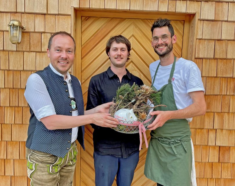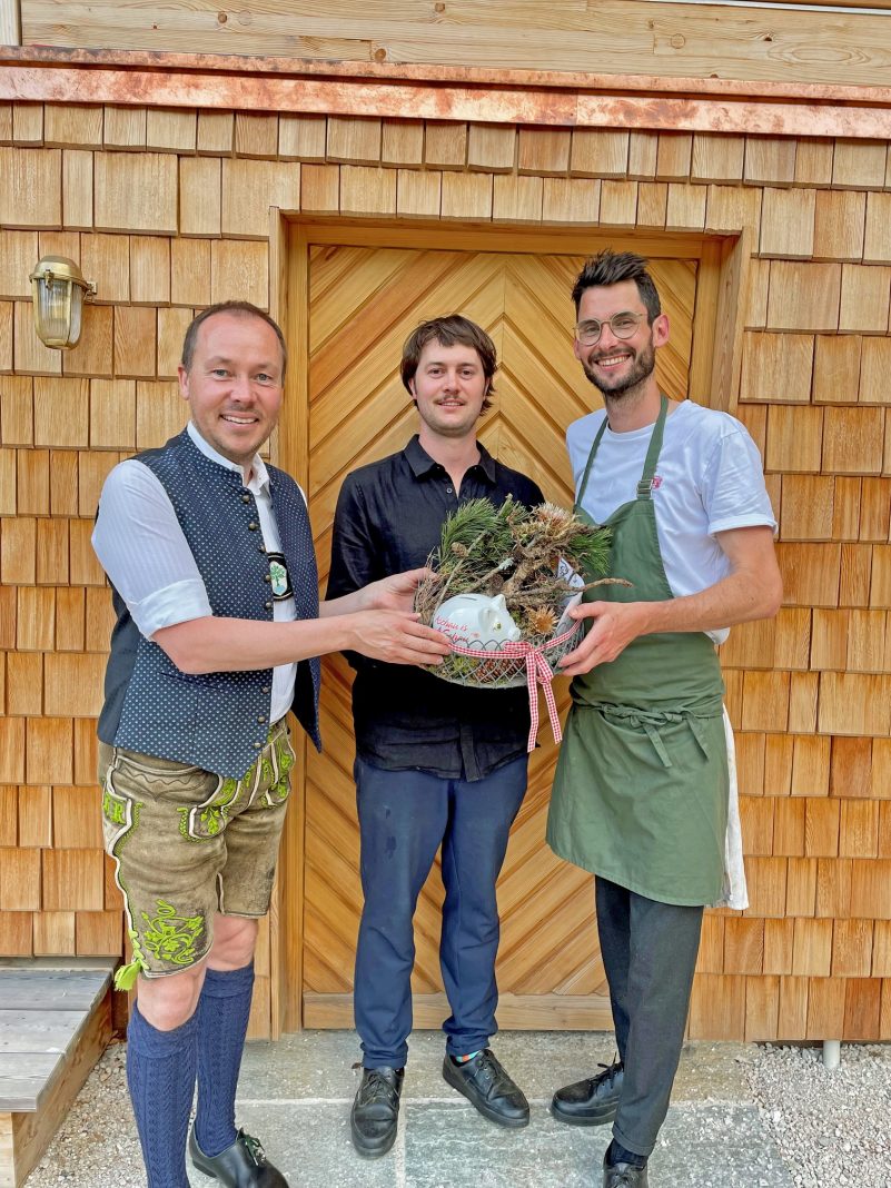 Ein sehr beliebtes Wanderziel von Aschau i.Chiemgau aus ist sowohl für Gäste und Touristen die Stubn in der Frasdorfer Hütte. Ja, es gibt Neues vom Berg, denn die Frasdorfer Hütte ist nun aus ihrem Dornröschenschlaf erwacht und freut sich darauf als Gasthaus STUBN neu entdeckt zu werden. Ein besonderer Ort auf einem Hochplateau in den Chiemgauer Alpen, 950 Meter über dem Meeresspiegel, an dem ab sofort kulinarisch ein wahrhafter Hochgenuss angeboten wird. Die Gerichte folgen dem Rhythmus der Natur und modern interpretiert. Die Zutaten stammen von Erzeugern aus der Region und aus der eigenen Land- und Forstwirtschaft. Design, Gemütlichkeit und kulinarischer Hochgenuss treffen hier zusammen. Ein Anlass für Aschaus Tourismuschef Herbert Reiter (links) zum Einstand ein Aschauer Spar-Glückschwein zu überreichen und die besten Wünsch Seitens des Tourismus zu überbringen. Max Müller – Küchenchef (rechts) und Felix Fröhlich – Restaurantleitung, (Mitte) freuten sich über die Geste aus dem Priental und hoffen auf eine konstruktive Zusammenarbeit.