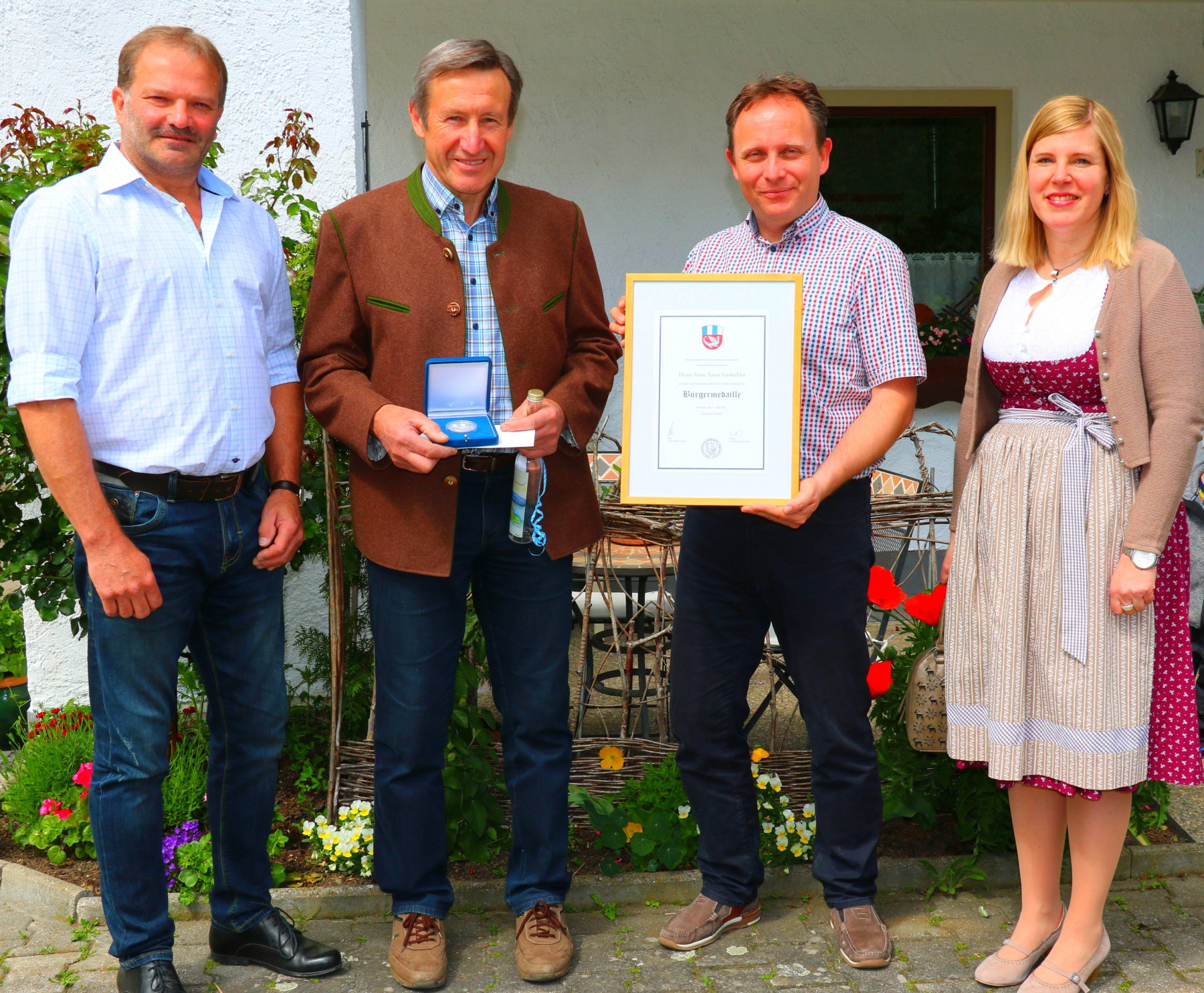 Bürgermeister Daniel Mair (zweiter von rechts) und seine beiden Stellvertreter Sepp Prankl (links) und Gabriele Stein (rechts) bei der Verleihung der Bürgermedaille an Franz Gasbichler (zweiter von links).