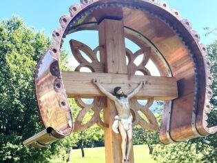 Gleichzeitig wurde auch der Wetterschutz bei einem bekannten Kunstschmied in Auftrag gegeben. Dieser hat nun das wirklich schön geformte und kunstvoll verzierte Runddach aus Kupferblech gefertigt. Und der Schneider Hias, selber ein gelernter Zimmerer, hat das aus einem Lärchenstamm gearbeitete Kreuz in der Mitte mit passend gestalteten Holzverzierungen ergänzt. Jetzt konnte der, in neuem Glanz erstrahlende Corpus angebracht, das schön gestaltete Runddach aufgesetzt, und das fertige, neue Flurdenkmal errichtet werden.