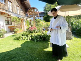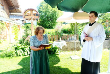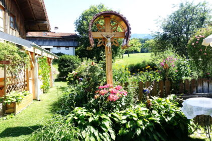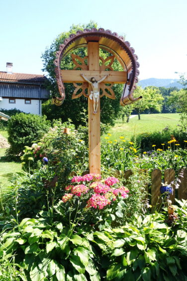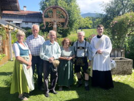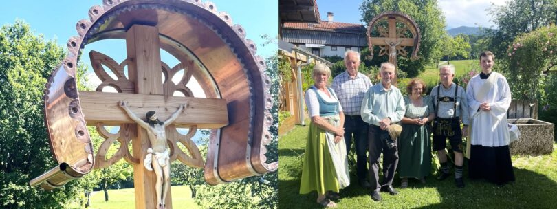 Auch der Standort wurde zuvor gut überlegt und ausgesucht. Nun steht dieses Kleinod gegenüber dem Haus, am Eingang zum Bauerngarten mit der herrlichen Blütenpracht. Ein schöner Standort, passend auch zu dem üppigen Blumenschmuck am Haus. In die gesamte Planung und Gestaltung war auch Familie Osterhammer mit eingebunden. Höhepunkt war dann die Kreuzsegnung am 1. Juli, einem absolut sonnigen Sommertag, einen Tag vor dem Fest Maria Heimsuchung.