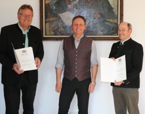 Josef Hollinger (links) und Peter Freund (rechts) erhielten aus der Hand von Bürgermeister Daniel Mair die kommunale Verdiensturkunde für ihre langjährige Tätigkeit im Frasdorfer Gemeinderat.