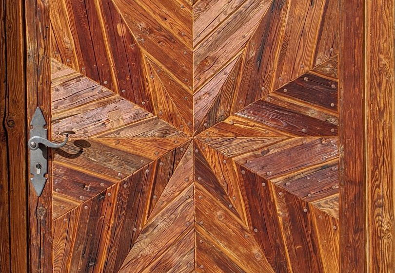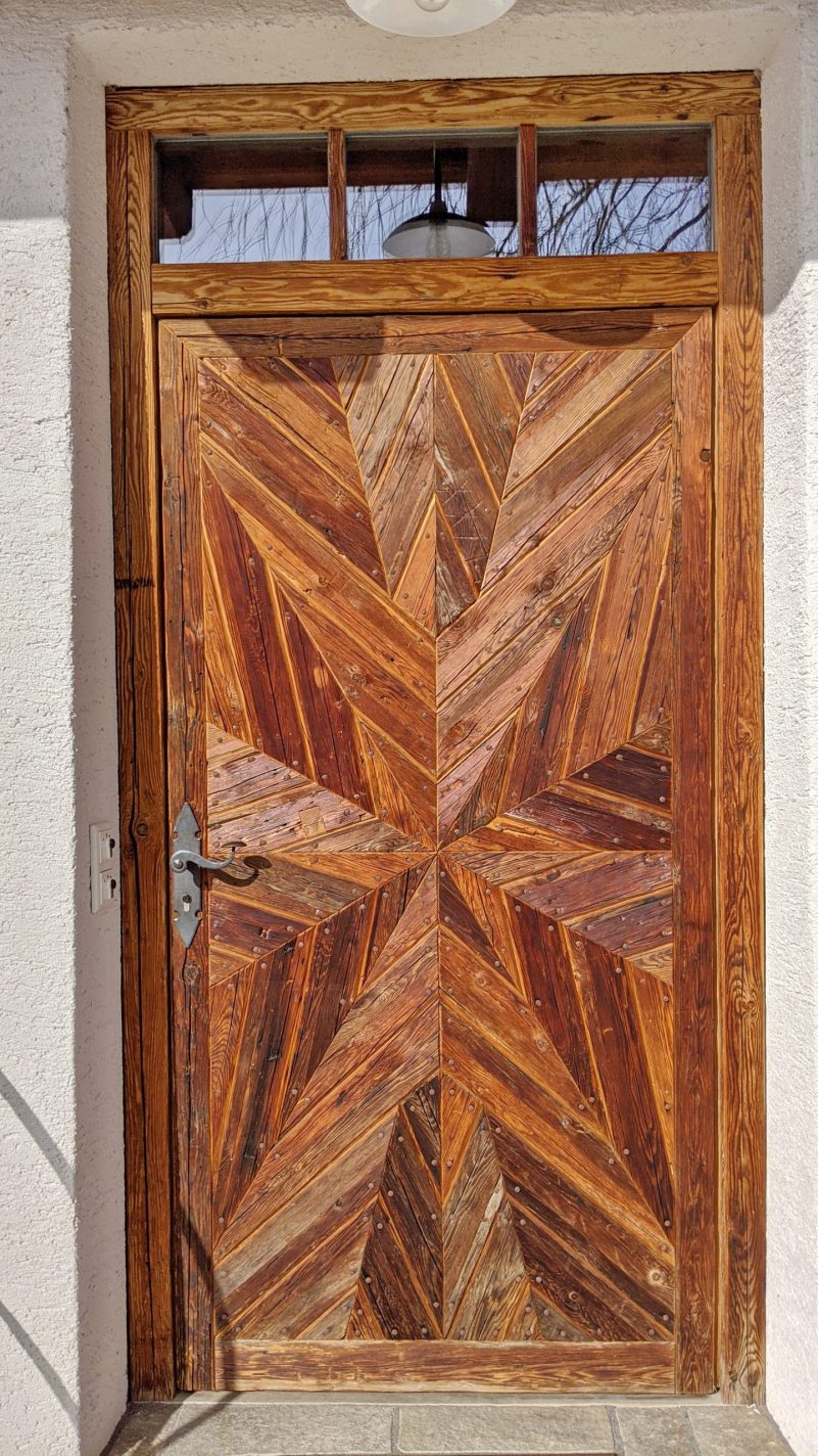 Dieses oben genannte Nebengebäude wurde 2016 errichtet. Doch bereits im Vorfeld haben sich die Erbauer viel Literatur über alte Bauernhäuser besorgt, und Häuser und vor allem auch Haustüren im gesamten Alpenraum angeschaut und Ideen gesammelt. Das Ergebnis war dann ein schönes, unsere Voralpenlandschaft prägendes Gebäude mit einer dazu passenden ebenso schönen Haustüre. Vor Anfertigung dieser Türe gab es mehrere Musterversuche. Schließlich wurde aus altem Holz, mit mehr als 200 alten Nägeln, eine neue Türe gefertigt, die isoliertechnisch und sicherheitstechnisch den aktuellen Anforderungen entspricht. Das Holz ist sternförmig eingelegt, sodass, bedingt auch durch die verschiedene Farbtönung des Holzes, zusätzlich eine optische Tiefenwirkung entsteht.