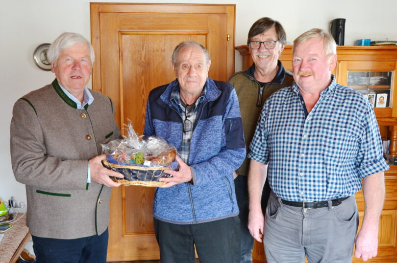 Foto: Ehrung von Jakob Winkler für langjährige Mitarbeit in der Vorstandschaft – von links: Lorenz Baumgartner sen. 1. Vorstand, Jakob Winkler, Sepp Winkler Schriftführer, Georg Buchauer 2. Vorstand.