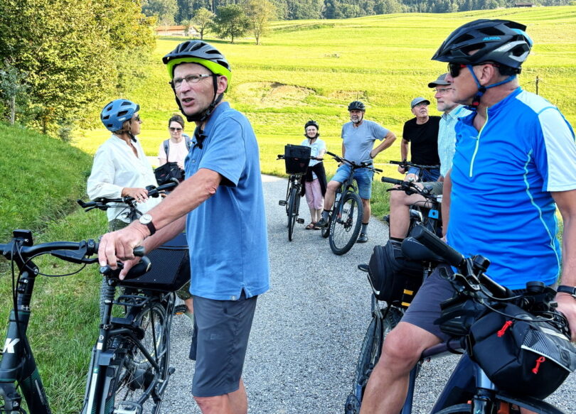 Der Heimat- und Kulturverein Frasdorf hatte zu einer Radtour über die „Vorderen Berghäuser“ und die Frasdorfer „Sonnseite“ eingeladen. Vorstand Rupert Wörndl, zugleich Ortsheimatpfleger, gab Erklärungen und machte dabei auch mit den Tafeln „Ortsgeschichtliche Informationen“, wie sie entlang der Frasdorfer Wanderwege angebracht sind, bekannt. Beim ersten Halt am Schwimmbad in Kaltenbrunn berichtete Wörndl, wie es zum Bau des Bades in den 1930er-Jahren gekommen ist, damals nur möglich durch umfangreiche Hand- und Spanndienste sowie Holz- und Geldspenden vieler Gemeindebürger. „Ein Stück oberhalb des Schwimmbades befand sich früher der sogenannte Glaserweiher . Der Glaser in Kaltenbrunn staute dort das Wasser immer wieder auf und konnte dann über hölzerne Rohrleitungen kurze Zeit einige Maschinen in seiner Schreinerwerkstatt antreiben.“ – so Rupert Wörndl. Noch um 1920 habe man im Winter in diesem Weiher Eis gewonnen, das mit Sägen herausgeschnitten werden musste, um es dann mit dem Ziehschlitten in den Gasthof Niederauer zu transportieren. Es diente zur Kühlung des Bieres über den Sommer.